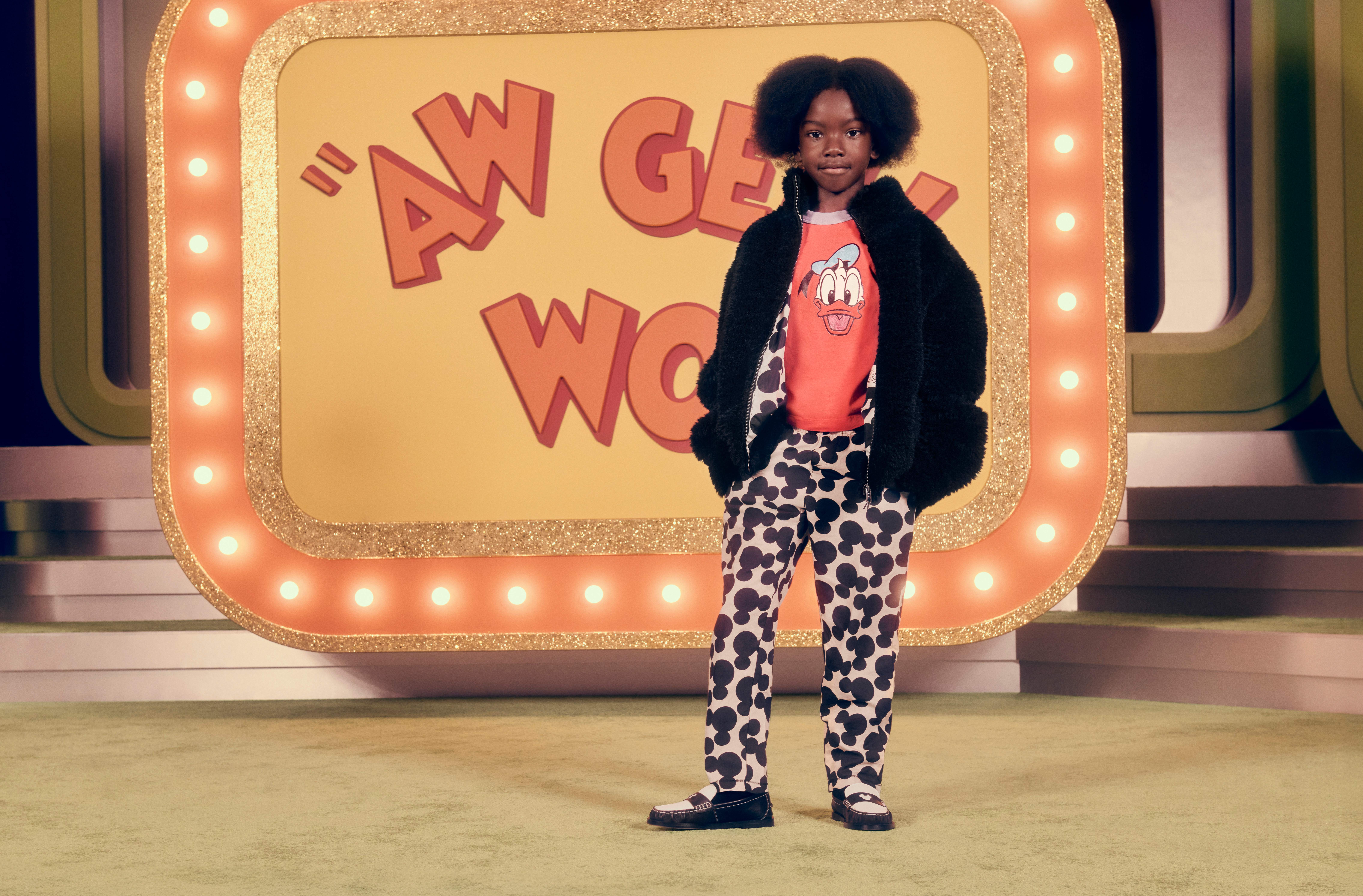 在女装系列中,成套搭配以毛茸茸的人造毛皮裙装和蝴蝶结嵌花针织开衫与长裤套装,另一款则是饰有仿皮草边的精致短西装。这些单品既可成套穿着,也可自由混搭,打造独特造型,让AW GEE! WOW的精神融入各种衣橱与场合。裙摆设计高挑,搭配大胆的波点图案与甜美的质感丝绸面料,构成了派对服饰。而丹宁单品则呈现慵懒随性的风格,可与宽松T恤与舒适针织搭配。黑色如动画师勾线般贯穿整个系列,为整体增添深度,凸显其他鲜明的色彩。
