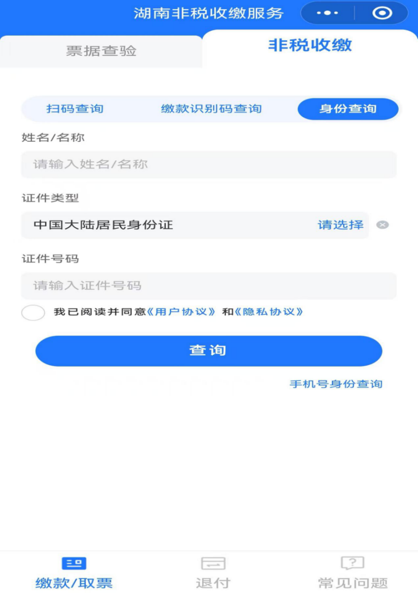 第三步:请点击“身份查询”,选择“证件类型”,输入姓名和证件号码后点击“查询”进行缴费。如下图所示: